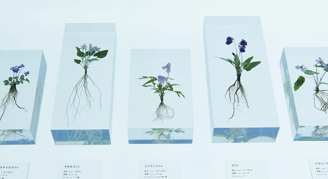 值得一提的是,由於公共空間的參與客群廣泛,囊括了學齡前幼童與相偎的老夫老妻,要設計出容易消化的資訊與擁抱群眾的互動空間並非易事。在TAKAO 599 MUSEUM裡面,活力滿點的孩子們可以到遊戲區攀爬覆蓋綠色絨毛的小型高尾山,奶奶們七嘴八舌地在展示區挑揀高尾山特有的各種毬果; 整點時刻,所有人都會聚集在一起觀賞虛實互動的數位投影秀(將動畫投影在一片展示著日本獼猴、赤狐、鼯鼠等動物標本的純白牆上),跟著畫面從東京市進入高尾山,隨著山中的四季更迭,牆上的動物標本活了起來,與他們的棲地興榮與共; 另一面螢幕則循環播送三個風格迥異的動畫,深入淺出地介紹入山要遵守的規則、六條登山路徑、山上珍稀動植物的數量,截然不同的三種視覺呈現方式令人驚艷,大人小孩都睜大眼睛釘在原地等著再一次重播。